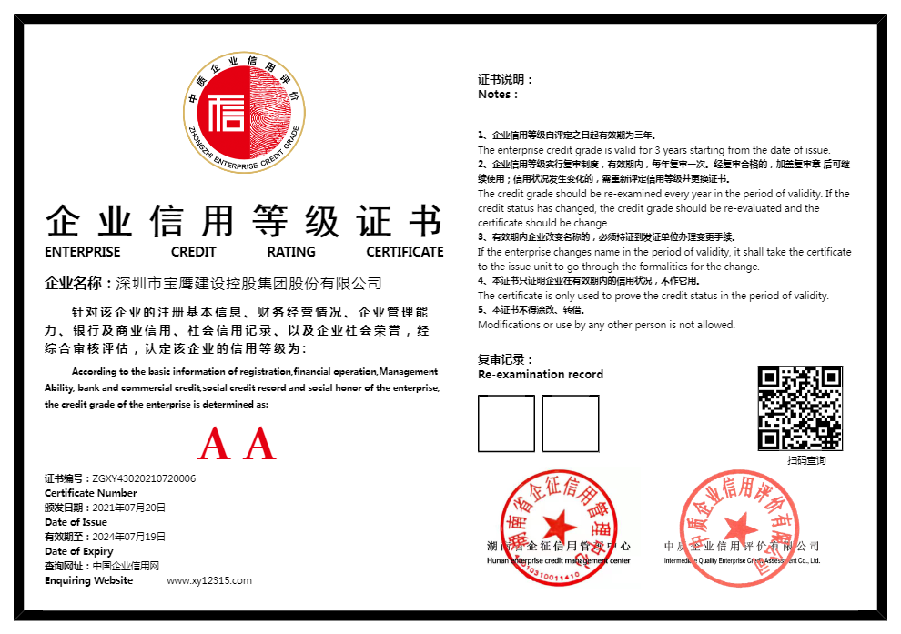 深圳市宝鹰建设控股集团股份有限公司已经在中质企业信用评价有限公司的企业信用网上提交了企业信用评价材料,我机构对该公司的企业注册信息、财务经营情况、企业管理能力、企业银行信用、企业社会信用、企业社会荣誉等信息进行核对,并针对该公司历史上是否存在违约失信行为进行例行调查,综合该企业所有情况,进行定量和定性分析,并依据相关信用评价标准,以公平、公正、客观、科学、独立的原则对该企业进行客观信用评级,评定该企业为信用等级 AA 级予以公示,在此期间,受评企业将接受全社会监督,如出现违约失信行为未被披露的,请实名制向评级机构举报。