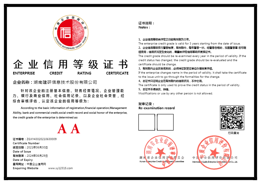湖南建研信息技术股份有限公司已经在中质企业信用评价有限公司的企业信用网上提交了企业信用评价年审材料,我机构对该公司年审材料进行核对,并针对该公司最近一年是否存在违约失信行为进行例行调查,综合该企业所有情况,重新进行定量和定性分析,并依据相关信用评价标准,以公平、公正、客观、科学、独立的原则对该企业进行客观信用评级,维持该企业信用等级 AA 级别,在此期间,受评企业将接受全社会监督,如出现违约失信行为未被披露的,请实名制向评级机构举报。